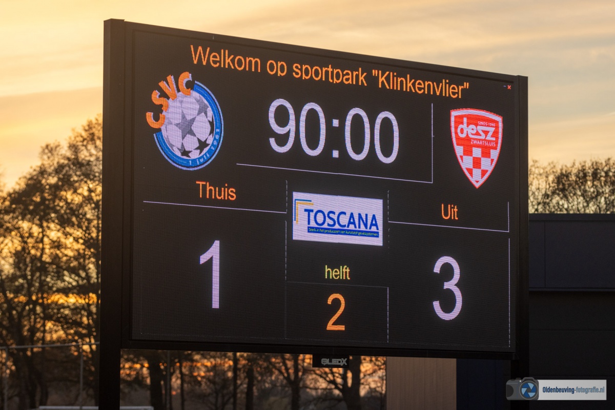 Maandag 24 november | In een stevig en bij vlagen grimmig duel heeft DESZ een knappe 1-3 overwinning geboekt op CSVC. De thuisploeg begon sterker en kreeg via een voorzet en enkele corners de eerste kansen. In de 13e minuut kwam CSVC op voorsprong, nadat de scheidsrechter opvallend genoeg door liet spelen na een elleboog op Schoonewelle.