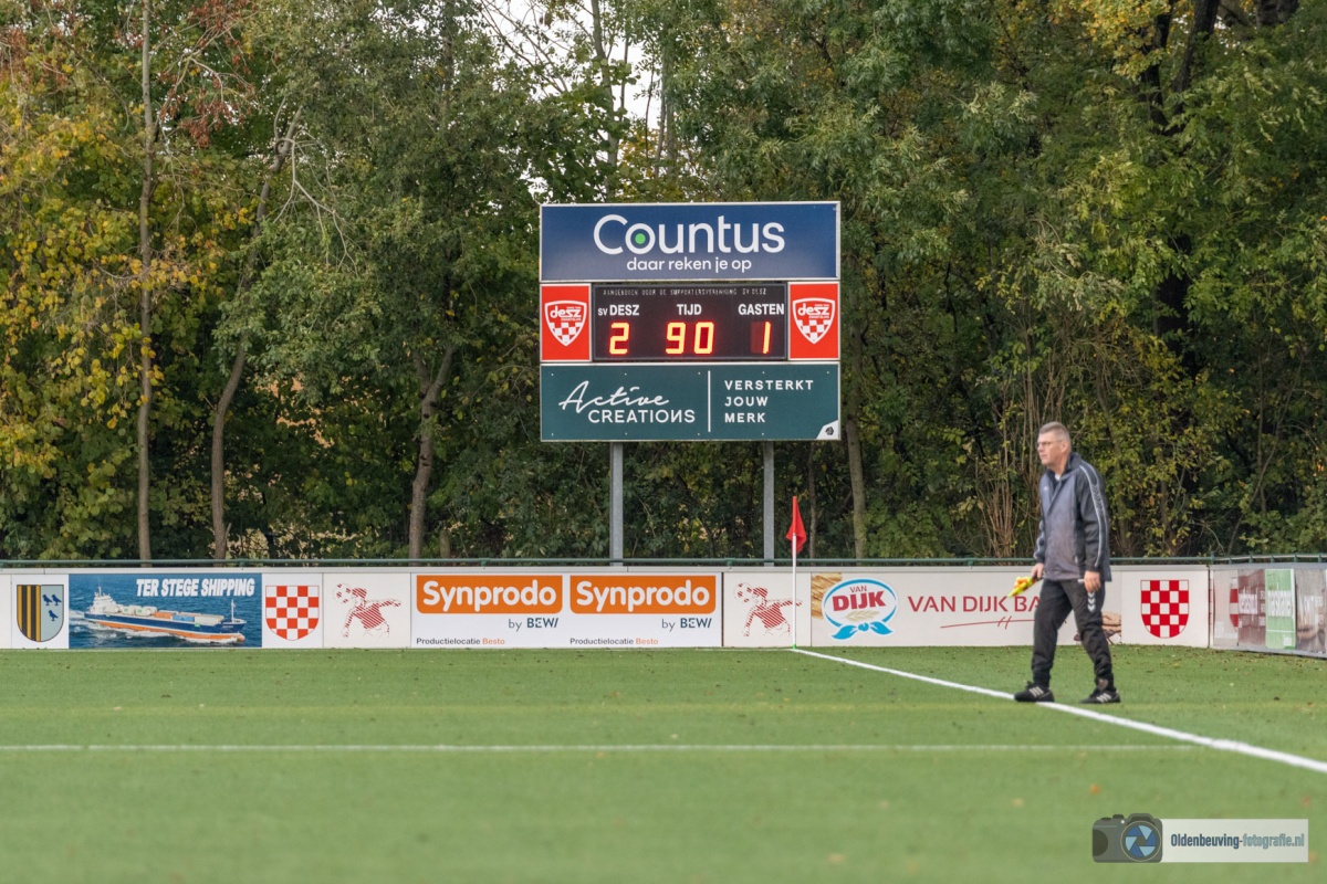 De Gaellemuniger haalde hiermee zijn gram bij de supporters en staf van de bezoekers, die hem de gehele tweede helft zaten op te jutten. Uiteraard dien je als volwassen speler daarboven te staan, maar met de emoties van het moment voelde het toch als gerechtigheid. Twee minuten later floot de scheidsrechter af en pakte DESZ de punten.