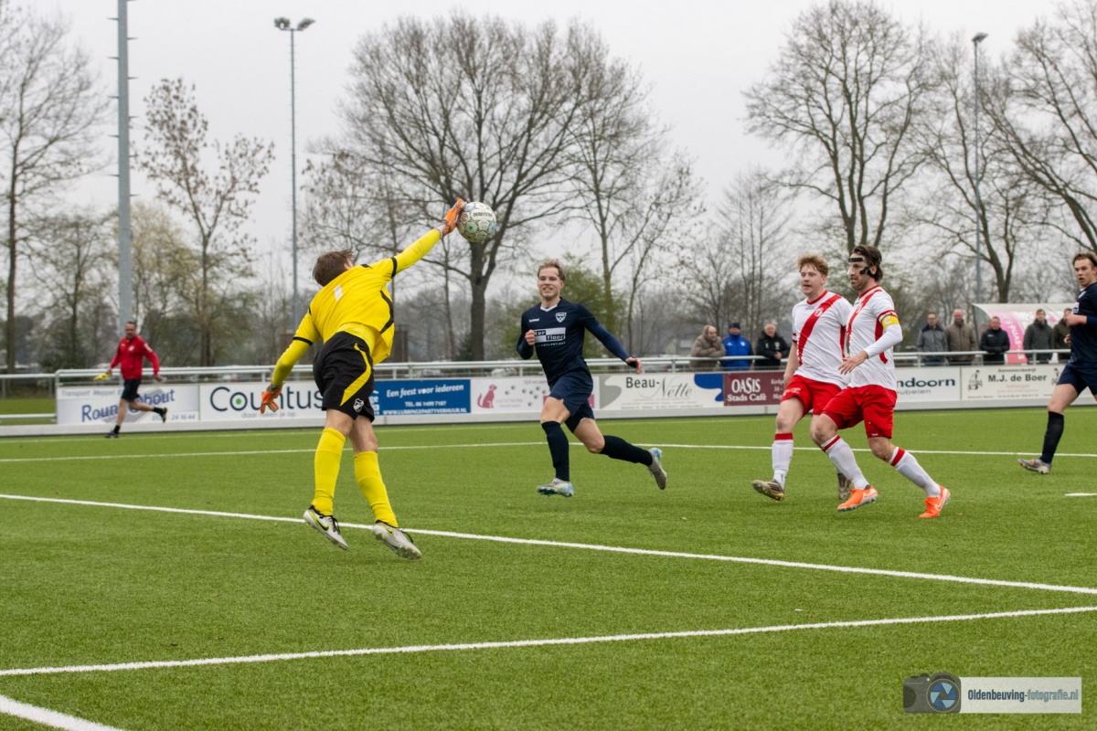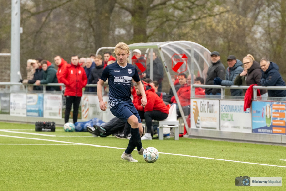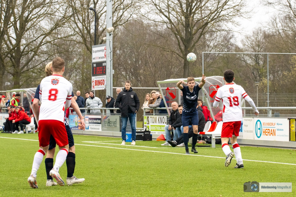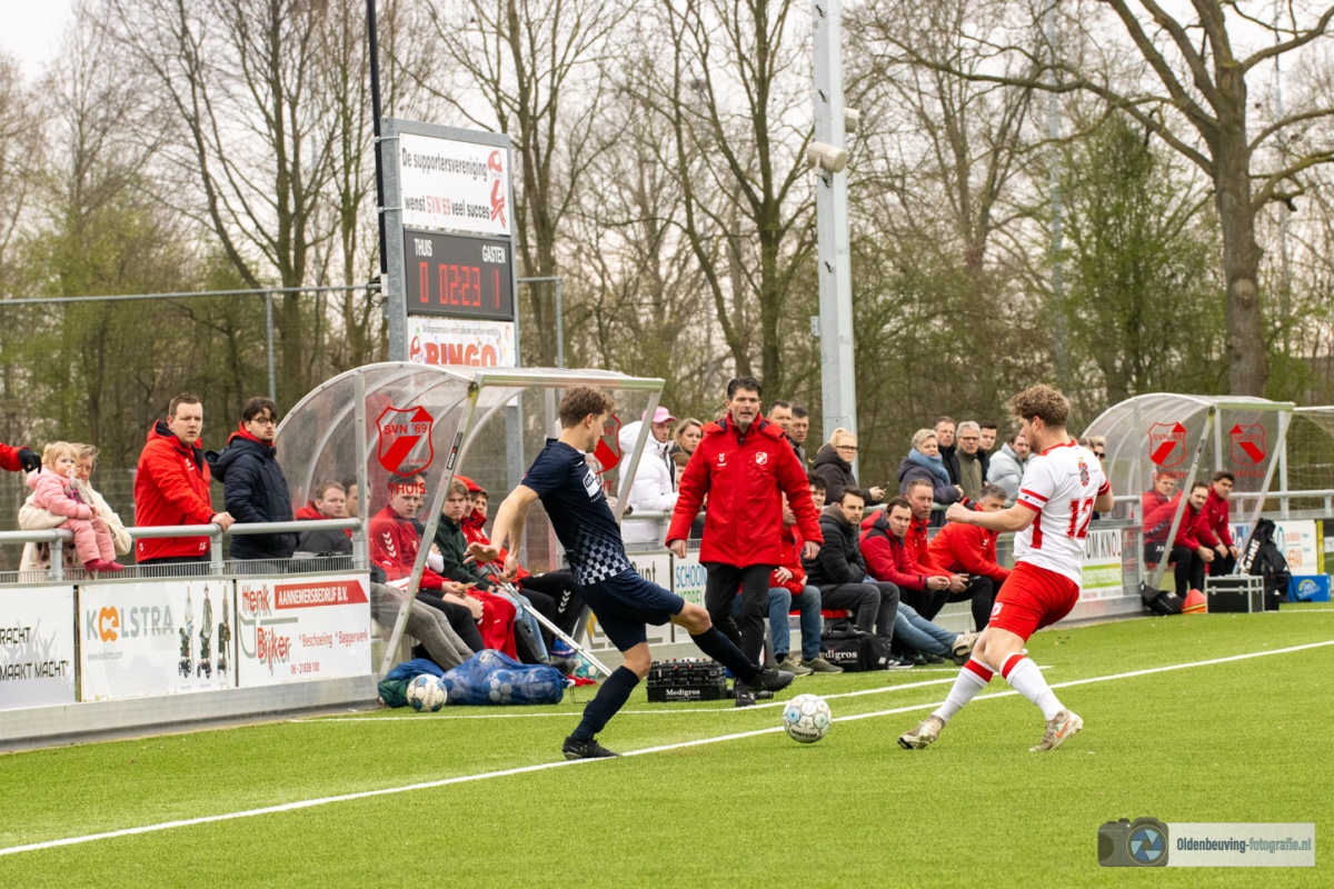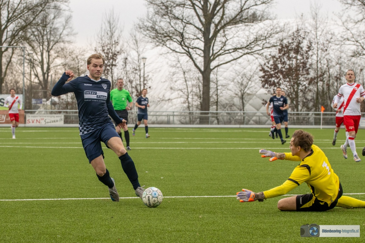 De enige kans van SVN komt vanaf de rechterkant. Een lage voorzet lijkt een makkelijke prooi voor de spits, maar helaas voor hem is Holthof scherp en blokt dit schot uitstekend.
