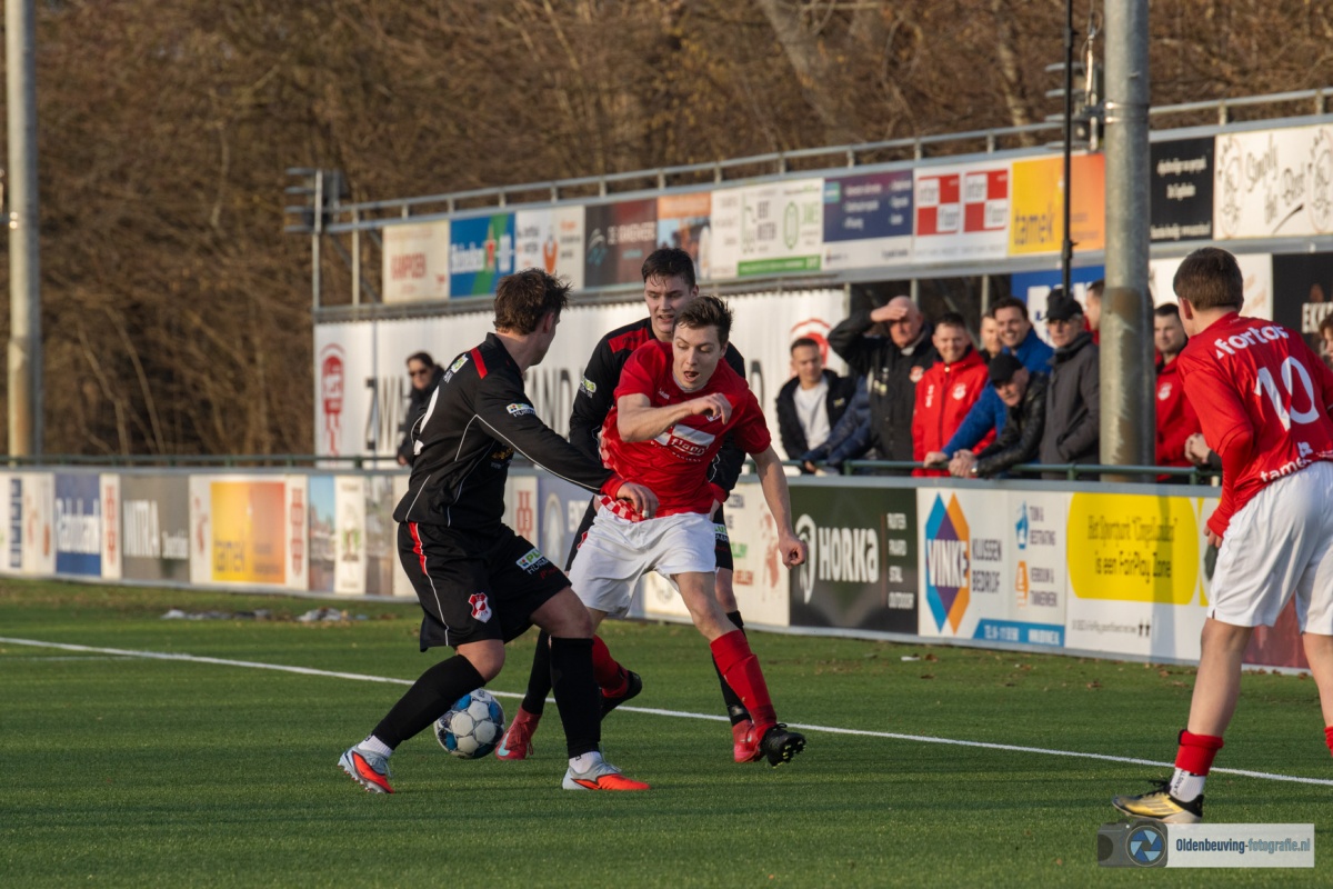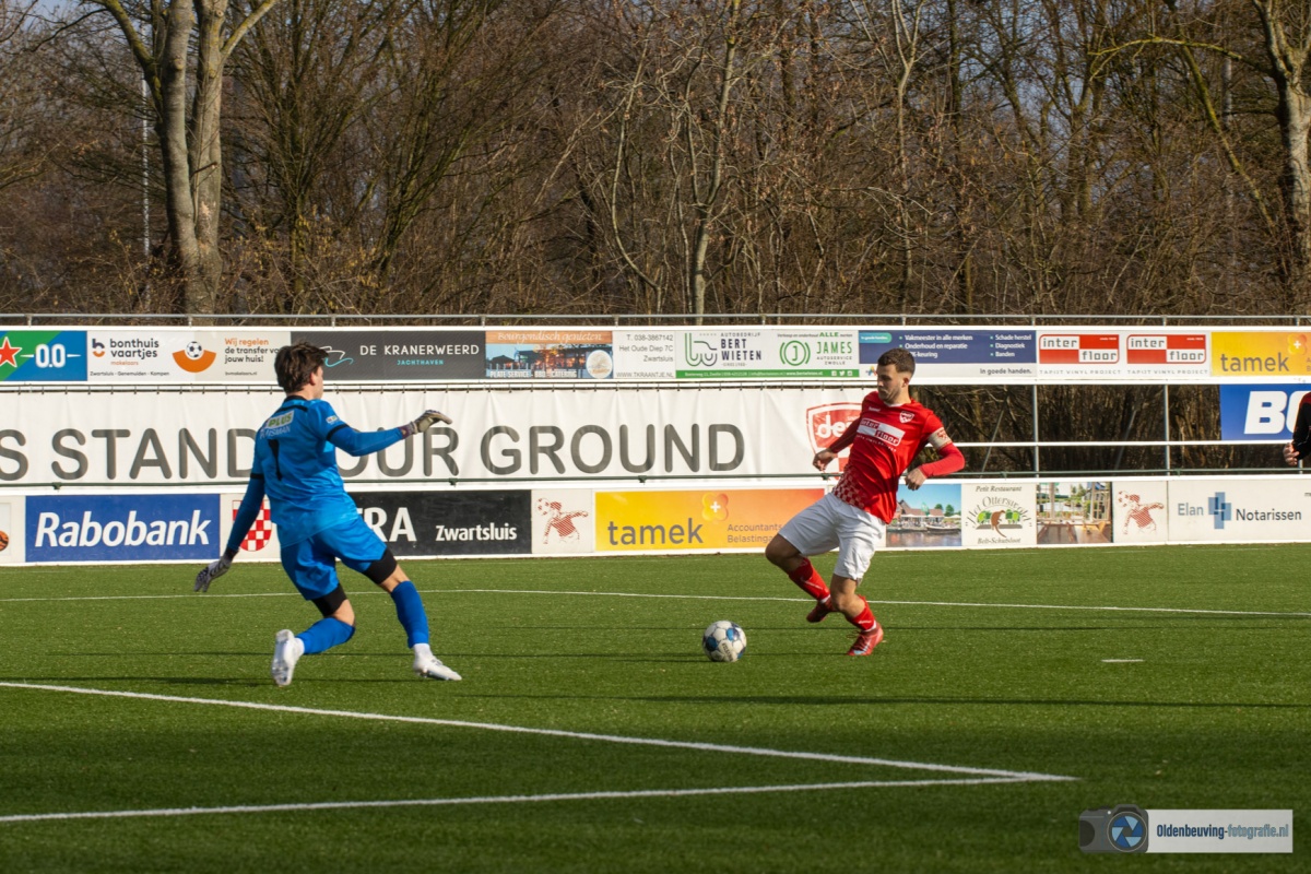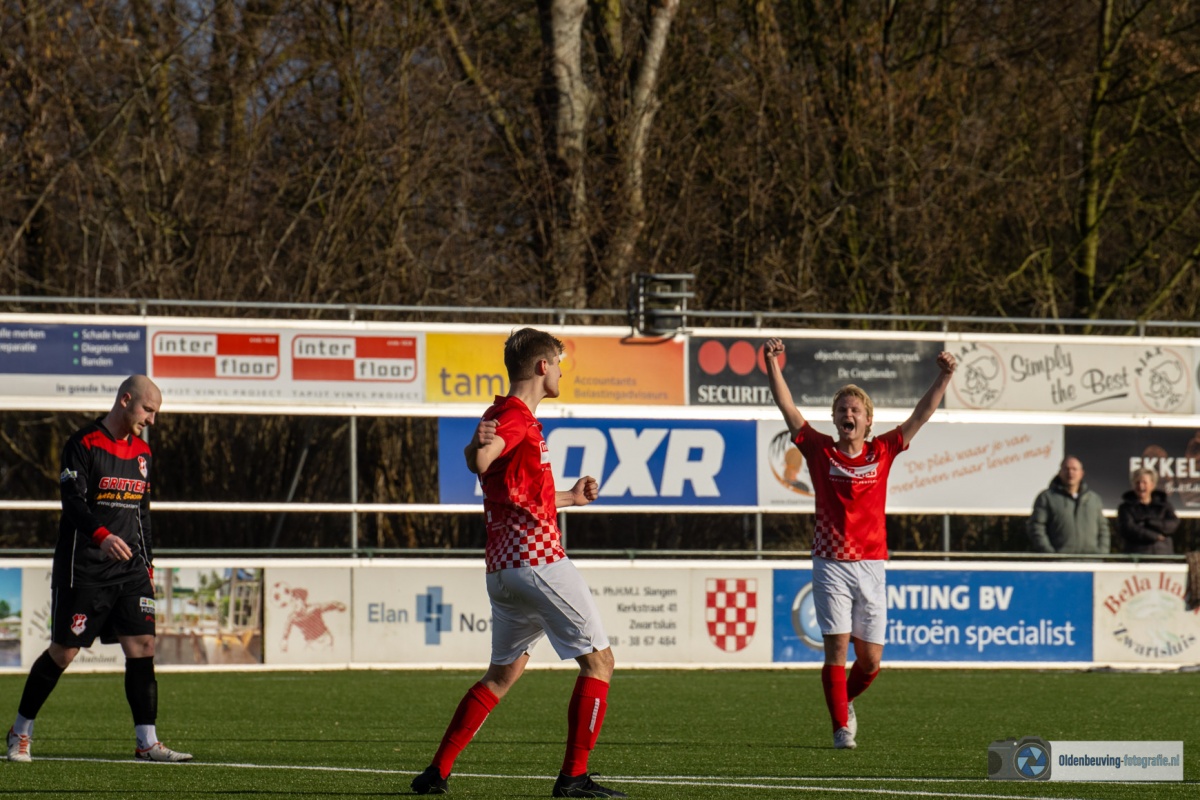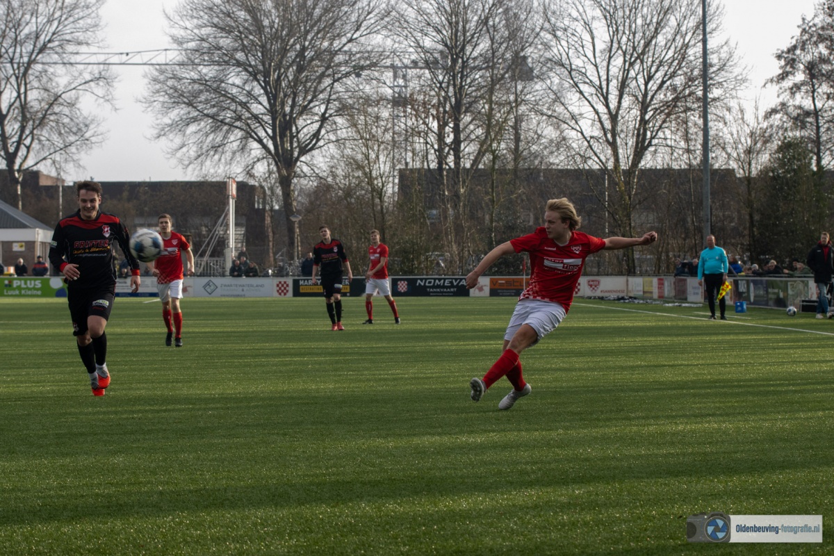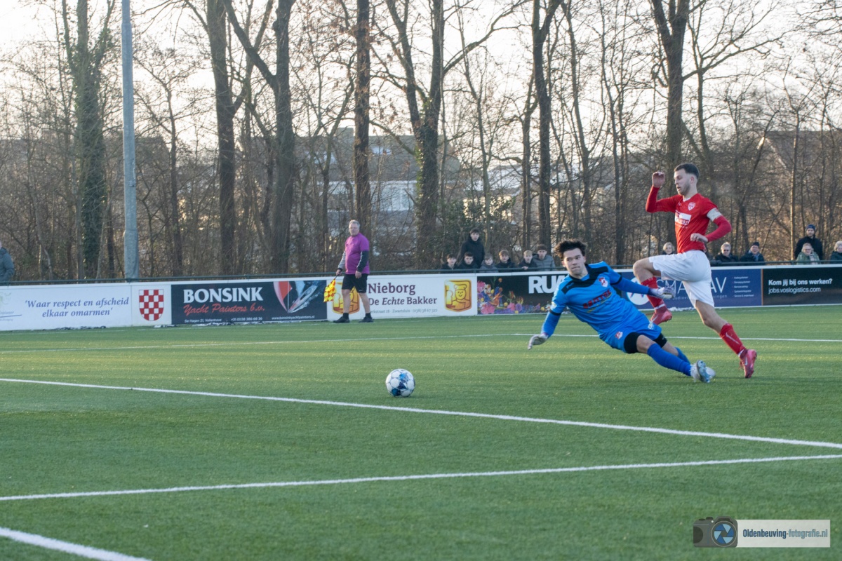 Niet veel later was het Schoonewelle die opstoomde en de 16 meter binnen kon lopen. De terugspeelbal kwam ditmaal terecht bij W. Akkerman die met rechts de bal mooi in de linkerhoek krulde (1-0). Elim probeert de voetballen, maar komt moeilijk onder de druk van Desz uit.