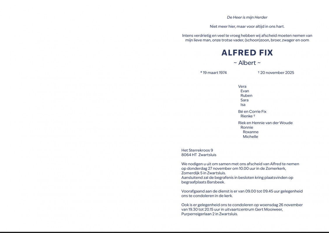 Wij nodigen u uit om samen met ons afscheid van Alfred te nemen