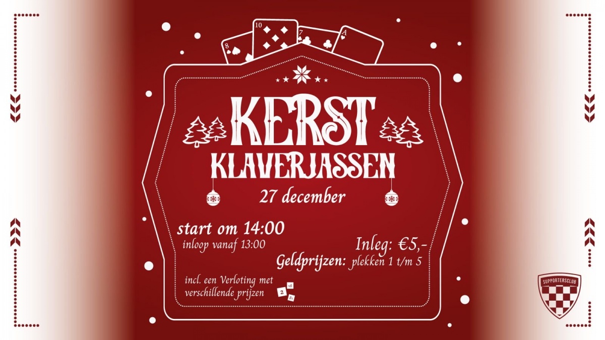 Vrijdag 5 december | Op zaterdag 27 december organiseert de supportersclub opnieuw een gezellige middag voor alle fanatieke (kerst)klaverjassers! Vanaf 13:00 staan de deuren van onze prachtige kantine open, en om 14:00 beginnen we met het klaverjassen. Naast het kaarten is er ook een verloting, waarbij mooie prijzen te winnen zijn. Ben je geen doorgewinterde (kerst)klaverjasser, maar heb je wel zin in een gezellige middag? Ook dan ben je natuurlijk van harte welkom!